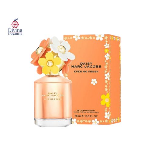 Fragancia floral para mujer. Esta es una nueva fragancia. Daisy Ever So Fresh se lanzó en 2022. Las Notas de Salida son mango, piña y mandarina; las Notas de Corazón son flor de naranjo y agua de rosas; la nota de fondo es madera de cachemira.