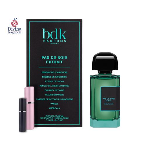 Al igual que su firma original, Pas ce Soir Extrait evoca el misterio y la sensualidad parisinos. Concentrada al 30%, esta creación más facetada es adictiva y gourmand. El cacao se mezcla con la frescura picante de la pimienta negra y el jengibre. Las voluptuosas notas de melocotón complementan la dulzura afrutada del chutney de membrillo y la flor de naranja. En la base, la esencia de pachulí y vainilla aportan potencia y profundidad. Una estela embriagadora de acentos florales y frutales.