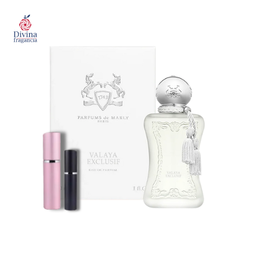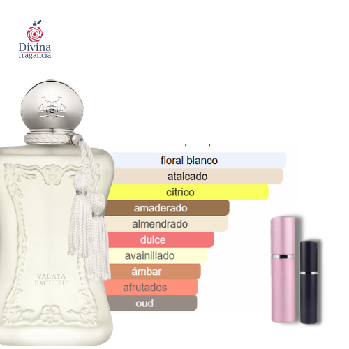 Valaya Exclusif de Parfums de Marly es una elegante fragancia femenina, lanzada en 2025, que envuelve los sentidos con un aura sofisticada y sensual. Su apertura combina el dulzor suave de la almendra con cítricos brillantes como la mandarina y la bergamota.